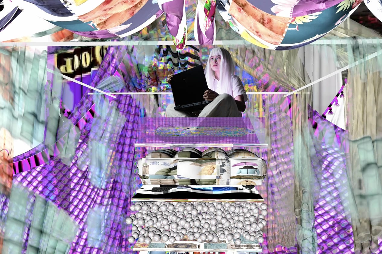 Li constructs a dreamlike space, interweaving images of high-end mattress advertisements circulated digitally. The snapshots of mattresses, digital clocks, carts, and receipts are stitched together, forming an endless scroll. With the constant tick-tock sound of the clock in the backdrop, a meticulously deconstructed mattress lies in the centre. The mattress is divided into multiple layers like a geological strata, claiming its undisputable comfort – latex, memory foam, mohair, horsehair, springs, and coils. Above it hangs a silky drapery suspended from a lavish tester canopy, signalling a privileged life. Below it sits an exhausted worker, dressed in a white outfit resembling PPE gear from factories or labs. The worker is drained of all colours. Her hair has turned entirely white, hinting at extreme stress. In contrast to the extremely pale complexion, her skin under the eyes turns almost blue and green from fatigue. Yet, on her lap, a laptop continues to glow with emails and advertisements, trapping her to the screen.